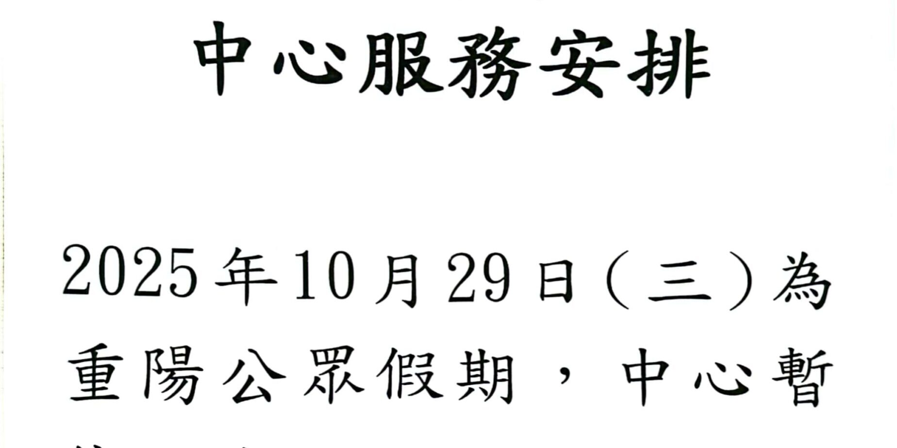 重陽節中心服務安排 2025年10月29日(三)為重陽公眾假期,中心暫停服務。 Author: Post navigationPreviousPrevious post:📚「我的情緒小故事」📚Related Posts📚「我的情緒小故事」📚MindfulKids®️ 第一階段訓練證書課程中心服務安排 (2025年9月6日至13日)SOUL Keeper義‧遊‧團2025-2026服務計劃2025年10-12月活動通訊「知友未來」生涯規劃服務計劃2022-25工作實戰計劃聯校分享會