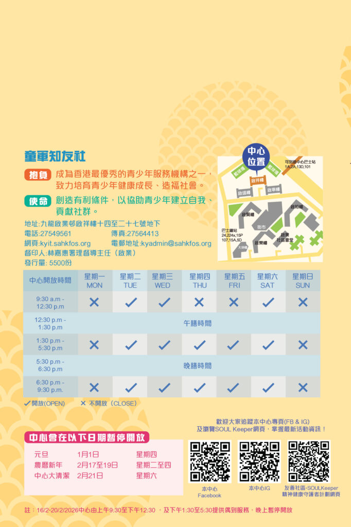 如有任何查詢,歡迎在開放時間親臨本中心或致電2754 9561向職員查詢。