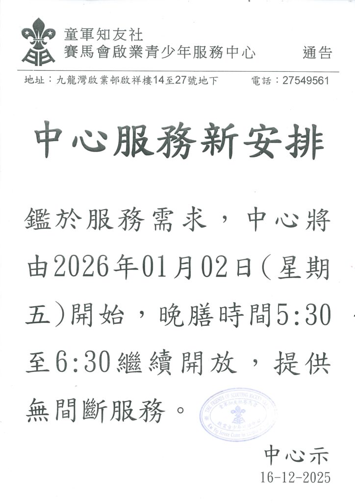 中心服務新安排 鑑於服務需求,中心將由2026年01月02日(星期五)開始,晚膳時間5:30至6:30繼續開放,提供無間斷服務。 中心示 Author: Post navigationPreviousPrevious post:親子蛋糕工作坊活動花絮Related Posts親子蛋糕工作坊活動花絮Smarteen情緒大使 活動花絮2026年1-3月活動通訊“我們一直都在”關懷兒童及青少年精神健康小冊子在災難中疏導負面情緒-繪本“面對不幸事件,我可以做啲咩?” Ig@st_ms_meow在災難中疏導負面情緒-繪本“我暫時要搬離屋企” @st_ms_meow